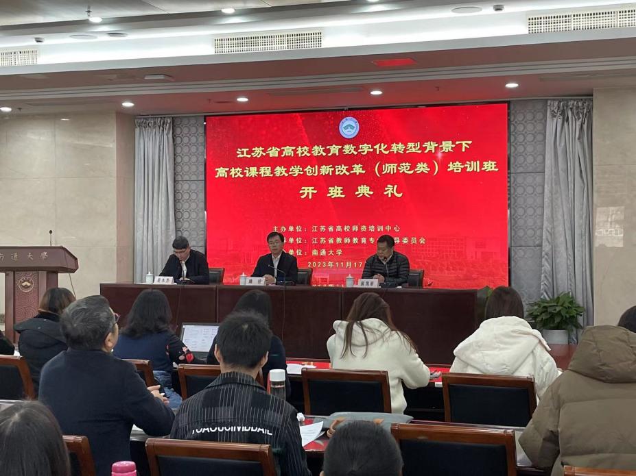 开班典礼由南通大学教师教育学院副院长姜永杰做主持。南通大学党委常委、副校长施佺同志对前来参加培训的全省各高校师范类同仁表示热烈欢迎,并介绍了举办本次培训班的目的意义、我校历年来承办情况以及本次培训班的学习安排。江苏省教师教育专业委员会副秘书长、南京师范大学基础教育研究中心副主任解凯彬同志做开班讲话,对本次培训提出几点要求:一是严守培训纪律,积极参与研修;二是珍惜培训机会,提升数字化意识;三是理论联系实践,提升培训实效;四是开展经验交流,互相学习进步。