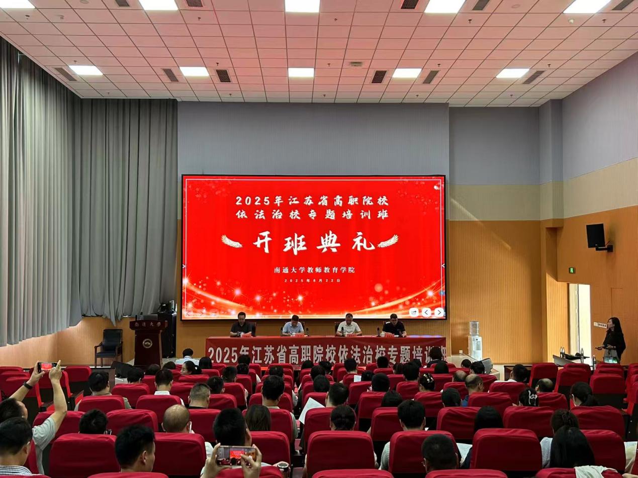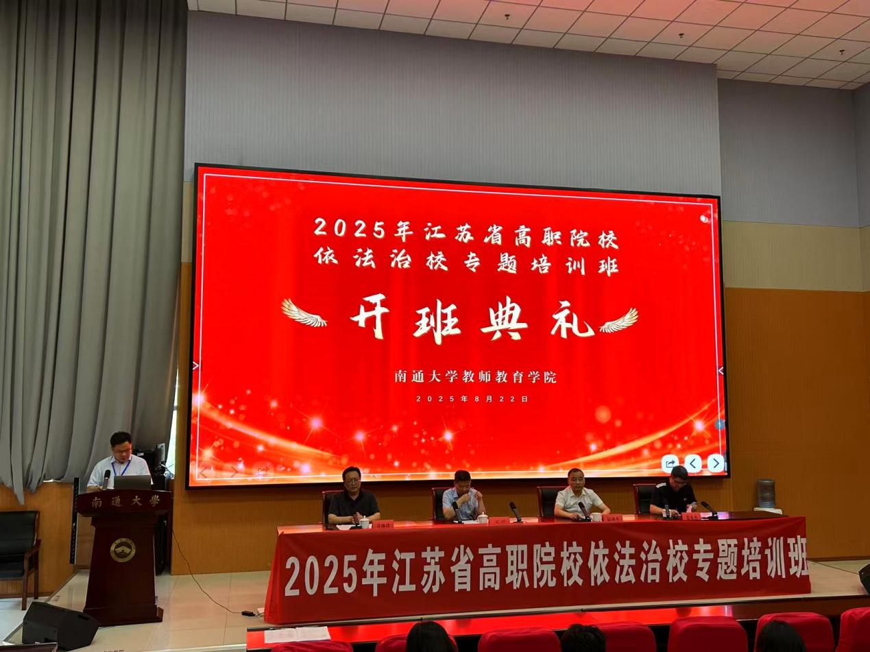 2025年8月22日,由江苏省教育厅政策法规处、江苏省教育厅教师工作处、江苏省高职师资培训中心主办,南通大学承办的“江苏省职业院校治理体系建设与管理能力提升项目依法治校专题培训班”在南通大学举行。江苏省教育厅政策法规处处长王兵、南通大学党委常委、副校长陆俊杰出席开班仪式。