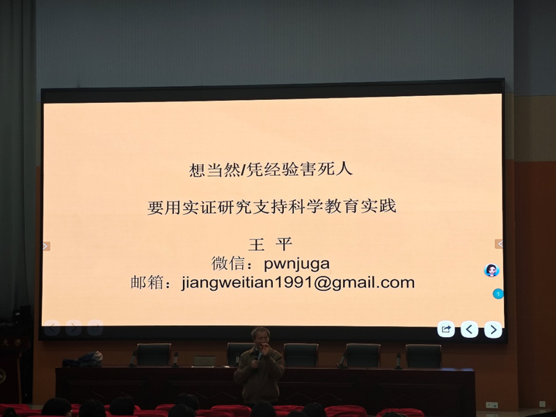 为提升教育硕士的国际化视野,引导研究生跳出“想当然教学、凭经验决策”的认知误区,树立实证研究支撑教育实践的专业理念,11月24日晚,南通大学教师教育学院举办了以“想当然/凭经验害死人——要用实证研究支持科学教育实践”为主题的讲座。本次讲座特邀美国密歇根州法明顿双语学校(K-8)科学高级教师、美国佐治亚大学科学教育博士王平主讲,学院全体2024、2025级教育硕士参与学习。