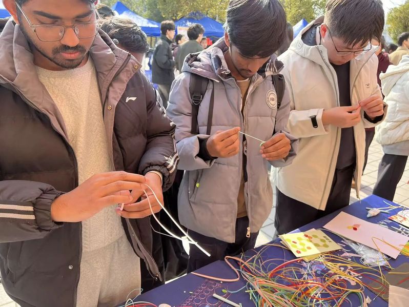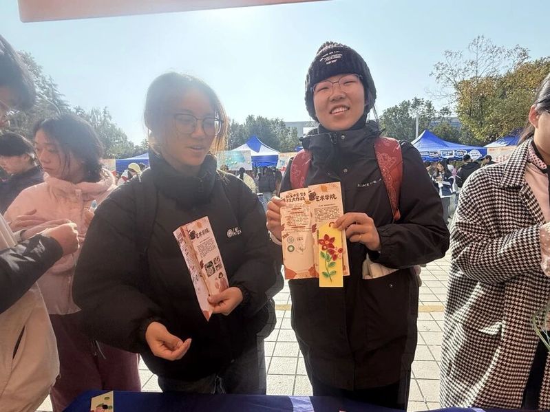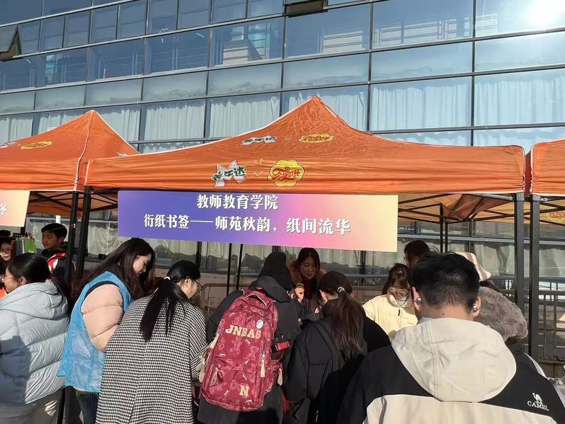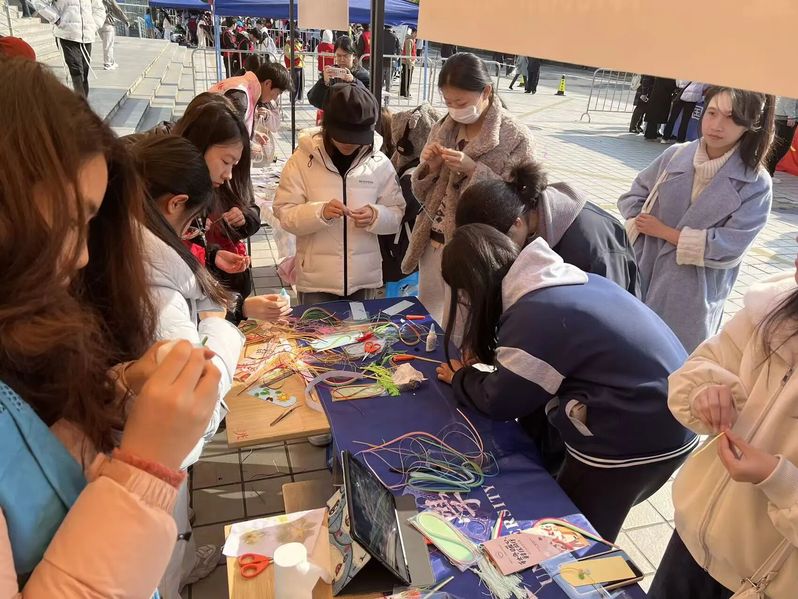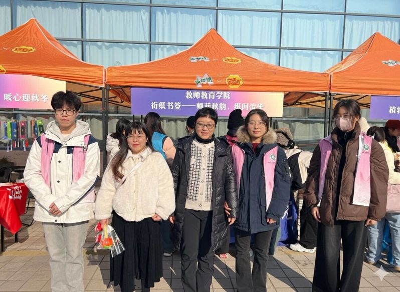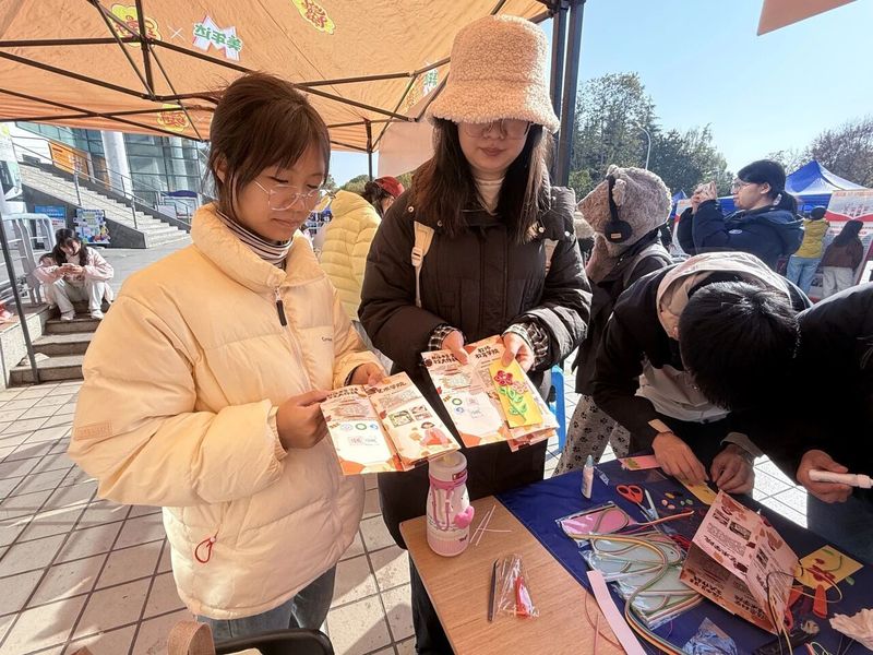 清晨八点,二食堂门口的摊位依次排开。蓝白相间的教师教育学院摊位在冬日阳光下格外醒目。长桌上,五彩纸带、衍纸笔、白胶等工具整齐排列,活动负责人精心制作的样品书签已然成了一道风景:灵动的蜻蜓、绽放的花草、静谧的海底世界……方寸之间,生机盎然。 随着人流渐密,摊位前热闹起来。志愿者们热情邀请路过的同学参与体验,耐心讲解每一个步骤:取一条草绿色纸带,以衍纸笔轻卷、放松、捏压,三秒后叶形初现;另选一抹柠檬黄,对折后反向卷起,花蕊立现。不到几分钟,一枚书签便完成了。简单几步,零基础的同学也能在几分钟内完成一枚独一无二的书签。“原来做手工这么解压!看着纸带在手中变成美丽的形状,什么烦恼都暂时忘记了。”一位刚完成书签的同学分享道。现场还有留学生被吸引而来,志愿者们用英语与他们交流,跨越语言的障碍,共享手作的乐趣。 随着人流渐密,摊位前热闹起来。志愿者们热情邀请路过的同学参与体验,耐心讲解每一个步骤:取一条草绿色纸带,以衍纸笔轻卷、放松、捏压,三秒后叶形初现;另选一抹柠檬黄,对折后反向卷起,花蕊立现。不到几分钟,一枚书签便完成了。简单几步,零基础的同学也能在几分钟内完成一枚独一无二的书签。“原来做手工这么解压!看着纸带在手中变成美丽的形状,什么烦恼都暂时忘记了。”一位刚完成书签的同学分享道。现场还有留学生被吸引而来,志愿者们用英语与他们交流,跨越语言的障碍,共享手作的乐趣。 志愿服务交流市集虽已落幕,但轻盈的书签仍在不同书页间穿行。它们如一片片被重新赋予意义的时光,提醒奔忙的我们:稍作停留,卷一片纸叶,让压力从指尖消散。