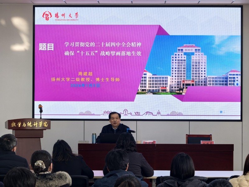 为深入学习贯彻党的二十届四中全会精神,切实将全院师生的思想和行动统一到全会决策部署上来,2026年1月9日下午,我院与数学与统计学院联合举办党的二十届四中全会精神专题辅导讲座,邀请扬州大学二级教授、博士生导师周建超教授作专题报告。报告会由数学与统计学院党总支书记刘丽莉主持。